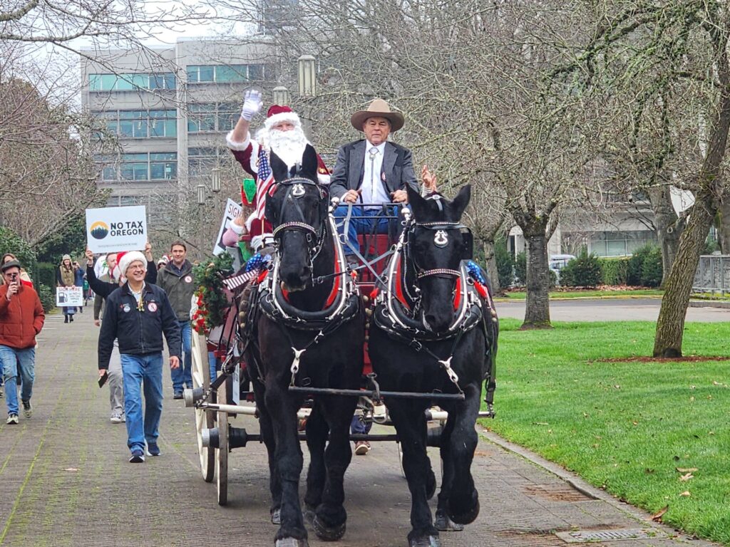No Tax Oregon delivered nearly 194,000 signatures—wrapped like Christmas presents and delivered by horse-drawn wagons—to Secretary of State Tobias Read’s office. (Photo Courtesy: Rep. Ed Diehl)
