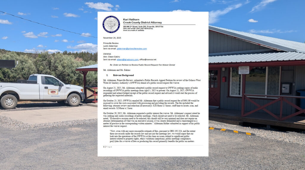 Crook County District Attorney Kari Hathorn’s ruling granting the petition, issued Nov. 24th, not only requires the OWWSA to waive all fees and produce the records by Dec. 5th, but also requires OWWSA to pay a $200 statutory penalty to the Prineville Review. The penalty—an option that can be requested as part of records petitions in recent years under a law that was passed by the Oregon legislature—was intended by state lawmakers to help deter unreasonable delays and bad-faith handling of public records by public bodies that required petitions to the DA’s and the Oregon DOJ.
