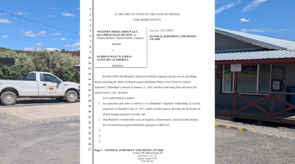 Prineville, Ore. – A Crook County Circuit Court judge has entered a default judgment and injunction against the Ochoco West Water and Sanitary Authority (OWWSA), ordering the district to release public records after it failed to respond to a lawsuit filed last fall by the Prineville Review.